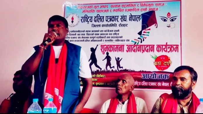 राजेश निर्माणी/रौतहट । राष्ट्रिय दलित पत्रकार संघ नेपाल जिल्ला कार्य समिति रौतहटको आयोजनामा बिहीबार वृन्दावन नगरपालिका–८ बहुअरीस्थित दलित धर्मशालामा भव्य शुभकामना आदानप्रदान कार्यक्रम सम्पन्न भएको छ। कार्यक्रममा मुख्य रूपमा दलित पत्रकार र अन्य पत्रकारहरूको हक–अधिकार, सामाजिक न्याय र समानताको विषयमा गम्भीर विचार-विमर्श भएको थियो।