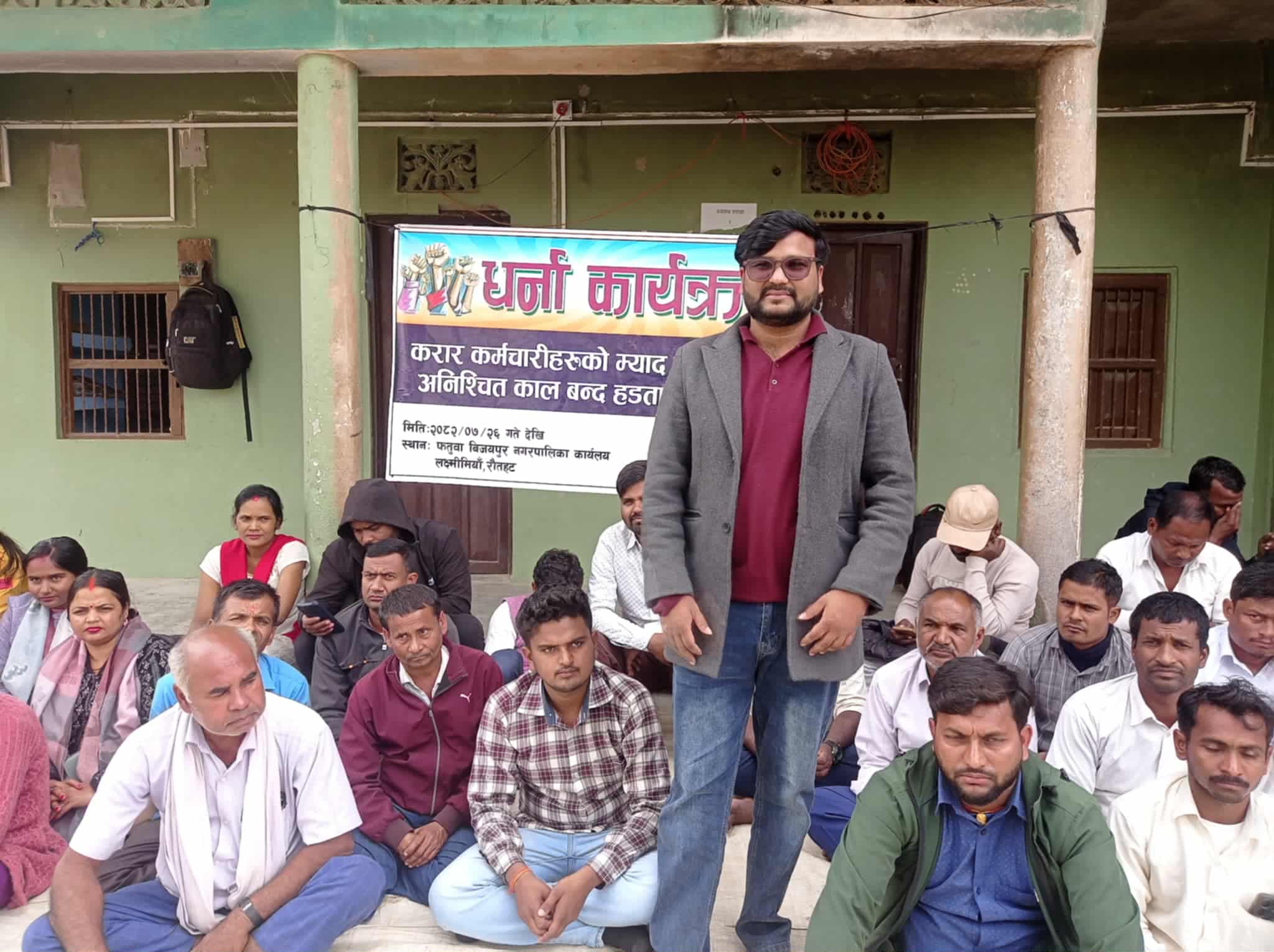 फतुवा–बिजयपुर नगरपालिकामा करार सेवाका कर्मचारीहरू म्याद नवीकरणको मागसहित १६ दिनदेखि धर्नामा बसेका छन्। करार अवधि नथपिएपछि सेवाप्रवाह प्रभावित बनेको भन्दै कर्मचारीहरू निरन्तर आन्दोलनमा छन्।